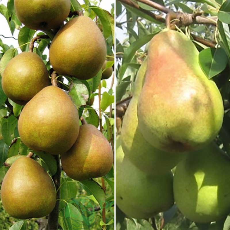 Груша дерево сад (Анжелис + Дельбар) - два сорта груш привитые на одном подвое. Саженцы с несколькими сортами на одном стволе удобные для садоводов. Многосортовые саженцы образуются в результате нескольких привоев. Груша Анжелис относится к зимних сортов, сбор урожая с третьей декады сентября и по вторую декаду октября. Отличается очень крупными плодами, вытянутой, слегка грушевидной формы 250 - 350 грамм и более, отличными товарными и вкусовыми качествами. Отличается высокой урожайностью, транспортабельностью и длительным сроком хранения плодов. Окраска желто-зеленая, мякоть плотная, мяслянистая, приятного сладкого вкуса с нежным ароматом. Устойчивость к бактериальному ожогу высокая, морозостойкость отличная. Груша Дельбар - летний сорт груши. Плоды удлиненно-грушевидной формы, крупные, средней весом около 200г, при прореживании - 280-350г, желтые с небольшим розовым туманом на солнечной стороне. Мякоть белая, плотная, нежная, хрустящая, очень сочная, сладкая, с приятным грушевым ароматом, отличного вкуса. Срок созревания - конец июля-начало августа. Плоды высокотоварные, после снятия могут хорошо сохраняться в течение длительного времени - около месяца. Дерево средне росла, зимостойка, достаточно устойчив к болезням.