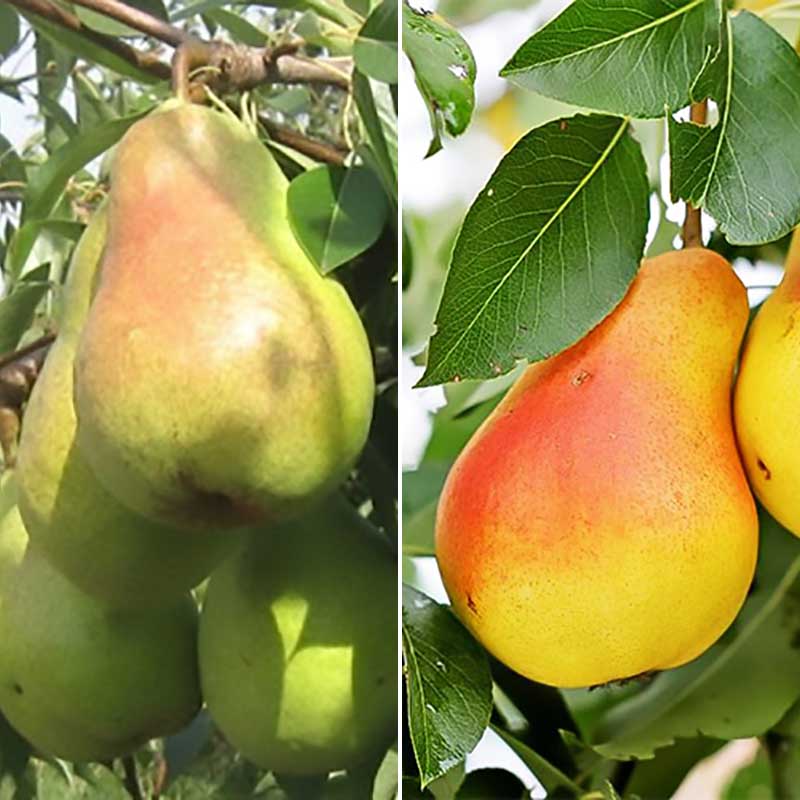 Груша дерево сад (Дельбар + Уильямс лето) - два сорта груш привитые на одном подвое. Саженцы с несколькими сортами на одном стволе удобные для садоводов. Многосортовые саженцы образуются в результате нескольких привоев. Груша Дельбар - летний сорт груши. Плоды удлиненно-грушевидной формы, крупные, средней весом около 200г, при прореживании - 280-350г, желтые с небольшим розовым туманом на солнечной стороне. Мякоть белая, плотная, нежная, хрустящая, очень сочная, сладкая, с приятным грушевым ароматом, отличного вкуса. Срок созревания - конец июля-начало августа. Плоды высокотоварные, после снятия могут хорошо сохраняться в течение длительного времени - около месяца. Дерево средне росла, зимостойка, достаточно устойчив к болезням. Груша Уильямс - летний сорт, имеет плоды слегка бугристые, очень душистые, покрытые тонковатой кожурой. Она имеет приглушенно-желтый оттенок с серыми разводами, с солнечной стороны окрашивается в розовый цвет. Сорт дает богатый регулярный урожай. Фрукты хорошо держатся на ветвях, минимизирует процент падалицы. Сбор урожая начинается в конце августа.