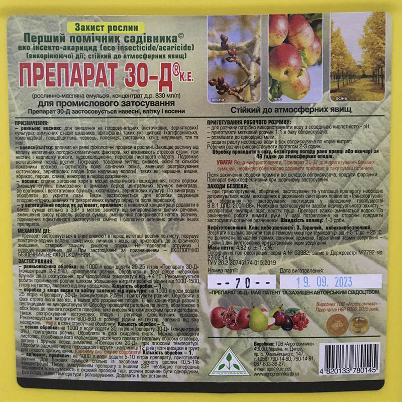 Препарат 30Д - это инсектоакарицид, антитранспирант, прилипатель на основе растительных масел.