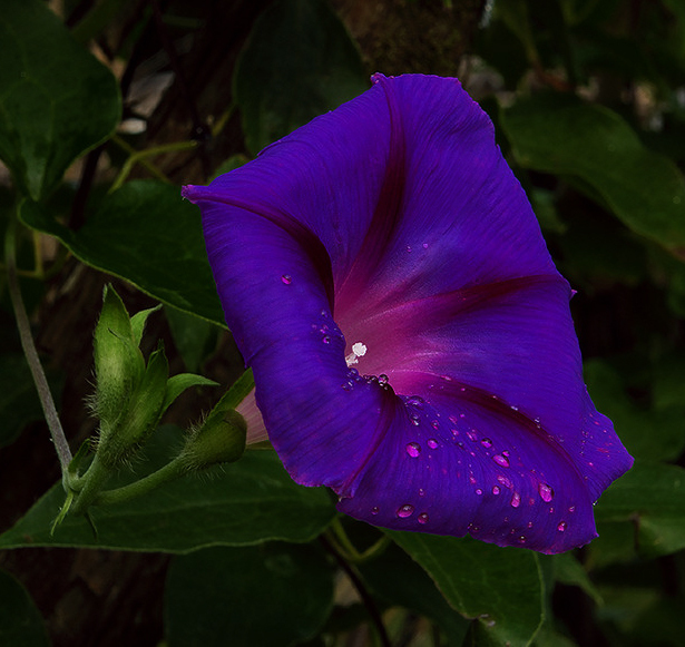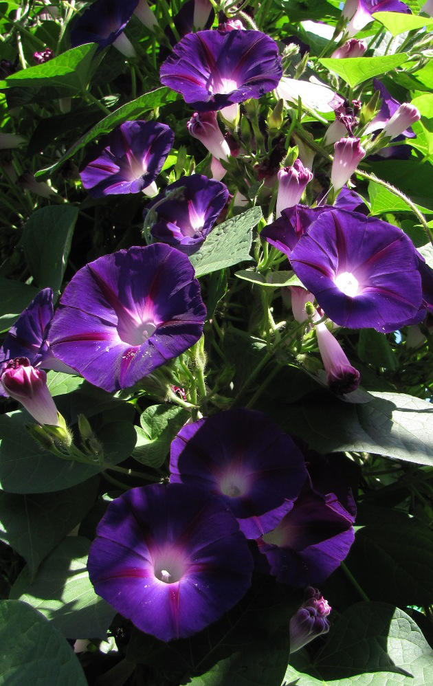 Ипомея Пурпурно-черная - однолетнее вьющееся растение, высотой до 3 м. Цветки крупные, воронковидные, темно-фиолетовые, диаметром до 6-8 см, открыты только днем. Светолюбивое и очень теплолюбивое растение, не выносит даже незначительных заморозков. Размножают посевом семян в мае на постоянное место по 2-3 семени в лунку или в торфоперегнойные горшки в марте - апреле на рассаду. Оптимальная температура для прорастания - 18 ° С. Всходы появляются через 10-14 дней. Выбирают участки, защищенные от ветров. Предпочитает рыхлые, питательные известковые почвы. Цветет с июня до октября. Используется при вертикальном озеленении балконов. Ипомеей хорошо затенять солнечные террасы или беседки.