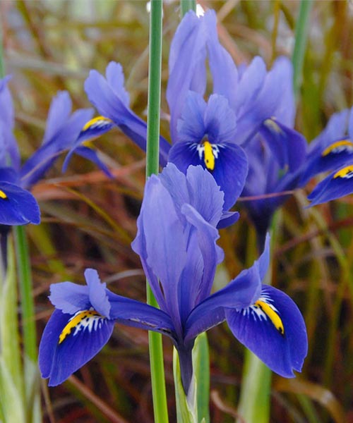 Ирис Ретикулата (Reticulata) – это многолетнее луковичное растение. Его высота составляет 10-15 см, а вместе с листьями достигает 50 см. Цветёт ранней весной, в конце марта (если весна ранняя) или в апреле. Цветки одиночные, выкрашены в оттенки синего, жёлтого, коричневого и белого цветов. Околоцветник состоит из шести лепестков. Размер цветка примерно 8 см в диаметре. Листья четырехугольные, длинные, тонкие, темно-зелёного цвета, которые после цветения сильно вытягиваются. Луковица яйцевидная, продолговатая, до 4 см длиной.