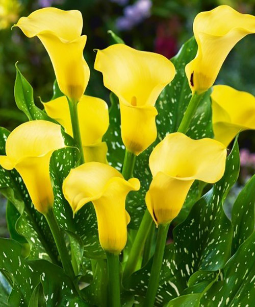 На фоне обильной, нарядной листвы возвышаются на прямых стеблях шикарные бутоны каллы сорта Cameo. Повышенный интерес к этому цветку обусловлен его сказочной окраской. Лепестки имеют неповторимый персиково-золотистый оттенок с черной сердцевиной внутри бутона, что придает растению интригующий шарм и невероятную эффектность. Подобное сочетание цветов на фоне насыщенного зеленого цвета листвы не оставит вас равнодушными и очарует с первого взгляда. Этот сорт каллы отлично подойдет для украшения вашей клумбы, беседки или водоема. Так же вы сможете создавать неповторимые букеты и радовать ими себя и своих родных. Как и многие другие клубневые растения, каллы – теплолюбивы. Поэтому в открытый грунт их можно высаживать не раньше апреля, когда уже миновала опасность заморозков. В домашних условиях выращивать цветы каллы можно в любое время года. На улице выбирайте полутень, поскольку цветы на ярком солнце быстро выгорают. Обязательно проследите, чтобы участок был защищен от ветра, в домашних условиях также избегайте сквозняков. Каллам нужен питательный, слабокислый грунт с хорошим уровнем влажности. При необходимости, обеспечьте полив, особенно в период цветения. Луковицы каллы высаживают на небольшом расстоянии, 15-20 см отступа вполне достаточно. Цветение начинается через 2,5 месяца после посадки луковицы, в благоприятных условиях может продолжаться до 1,5 месяцев. В этот период обязательно позаботьтесь о поливе. Перед наступлением заморозков луковицы обязательно выкапывают и хранят до следующего посадочного сезона. Домашние цветы можно оставить в горшке, уменьшив полив.
