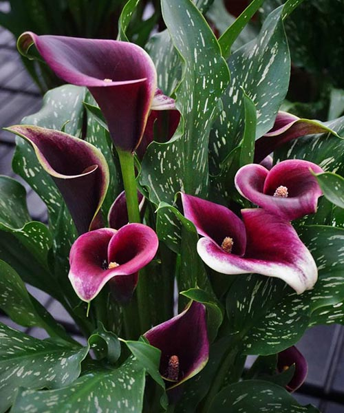 Калла Dubai Nights (Дубай Найт) – очень декоративное растение, хорошо сочетающееся с другими цветущими растениями. Элегантные темно-фиолетовые цветы станут хорошим акцентом на клумбах, а также широко применяемыми флористами для формирования цветочных букетов. Высота растения около 75 см. Листья зеленые, сердцевидные, с белыми прожилками, верхушка слегка заострена. Сезон цветения кала начинается с мая и длится до августа, соцветие держится на кусте в течение 1,5 месяца. Цветок окрашен в насыщенно бордово-пурпурные тона с кремовыми краями, диаметром 10 см и высотой до 8 см. Аромат едва уловимый, но приятный. Выращивать кала Dubai Nights можно как в открытом грунте, так и в горшках. После установки стабильного тепла его можно высаживать на гряды не глубже 10 см с интервалом около 40 см. Для лучшего роста и образования крупных бутонов (а из одного клубня может вырасти до 10) его следует высаживать на солнечные зоны. Для выращивания в контейнерах клубни высаживают в конце марта. Для этого выбирают горшок объемом около 3 литров. Весь сезон почву увлажняют подкисленным составом воды, избегая ее застоя. После периода цветения желательно удалить лишние листья. После цветения наступает время покоя, а осенью клубни выкапывают, просушивают и содержат в сухом помещении с температурой 7-9 С.