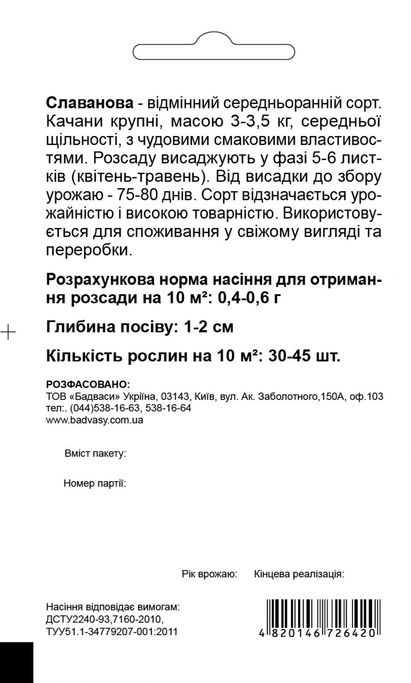Капуста Славанова, 1 г, Садыба