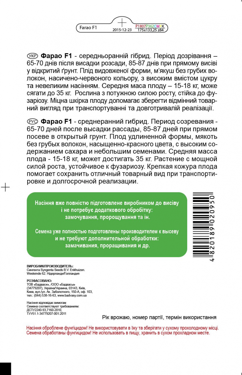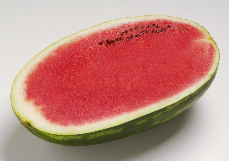 Среднеранний гибрид. Период созревания - 65-70 дней после высадки рассады, 85-87 дней при прямом посеве в открытый грунт. Плод удлиненной формы, мякоть без грубых волокон, насыщенно-красного цвета, с высоким содержанием сахара и небольшим семенами. Средняя масса плода - 15-18 кг, может достигать 35 кг. Растение с мощной силой роста, устойчивое к фузариозу. Крепкая кожура плода помогает сохранить отличный товарный вид при транспортировке и долгосрочной реализации.