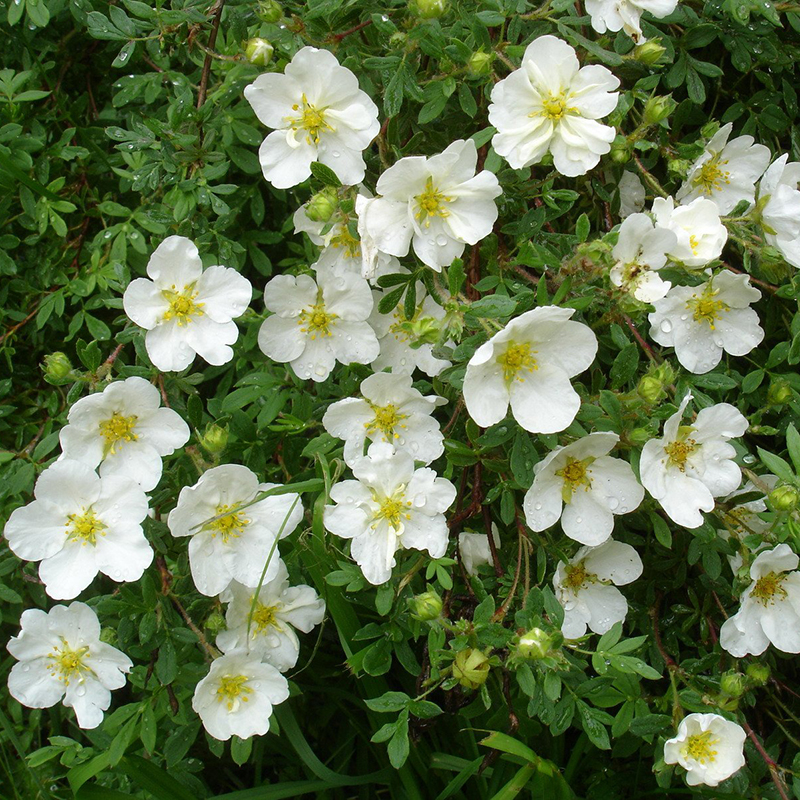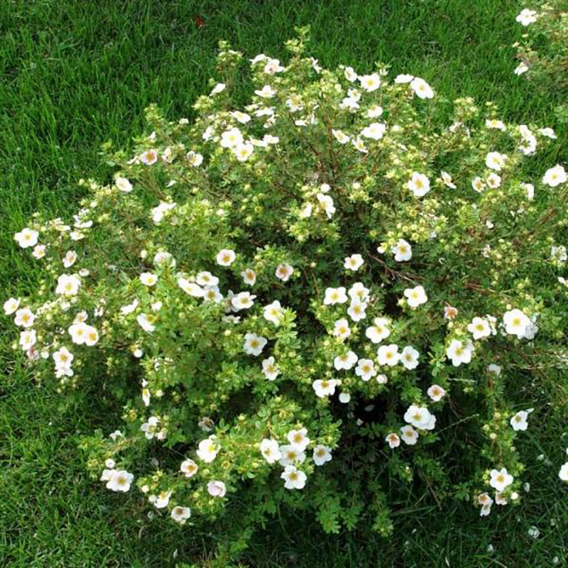 Лапчатка белая Абботсвуд – компактный куст с округлой формой, цветущий небольшими, но многочисленными белыми цветками.