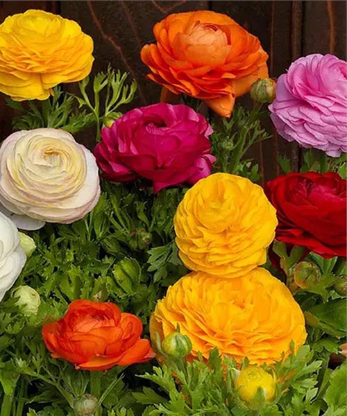 Лютики Авив Микс (Aviv Mix) удивительные цветки этого растения размером 5-7 см в диаметре и очень похожи при раскрытии бутонов – на розы, а в полном расцвете – на маленькие махровые маки: белых, красных, оранжевых, желтых, розовых, малиновых оттенков. Взрослое растение достигает в высоту 30-40 см, имеет глубоко рассеченные листья. На каждом стебельке распускается по несколько цветков.