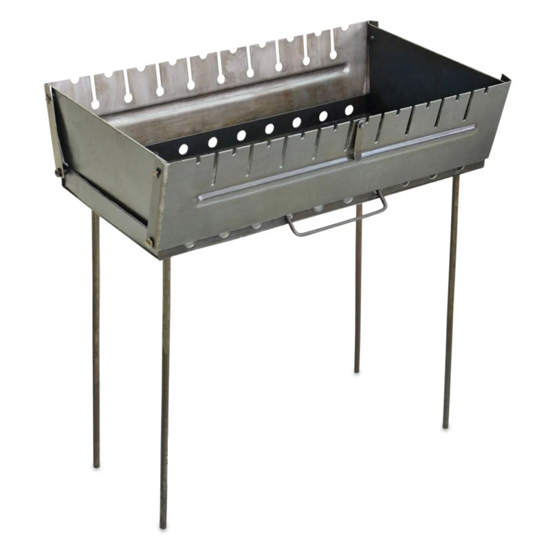 Конструкция мангала-чемодана имеет прямоугольную форму, изготовленную из прочной листовой высококачественной стали. Толщина составляет 3 мм, что позволяет выдерживать высокие температуры.