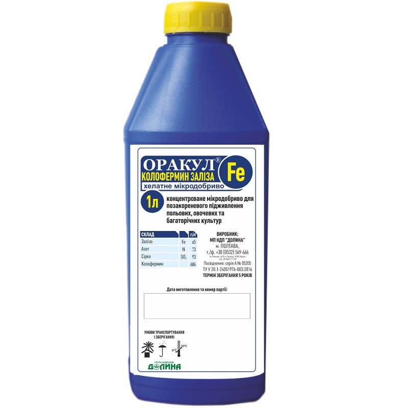 Оракул колофермин железа - концентрированное микроудобрение для внекорневой подкормки овощных, плодовых, декоративных культур, ягодников и винограда.