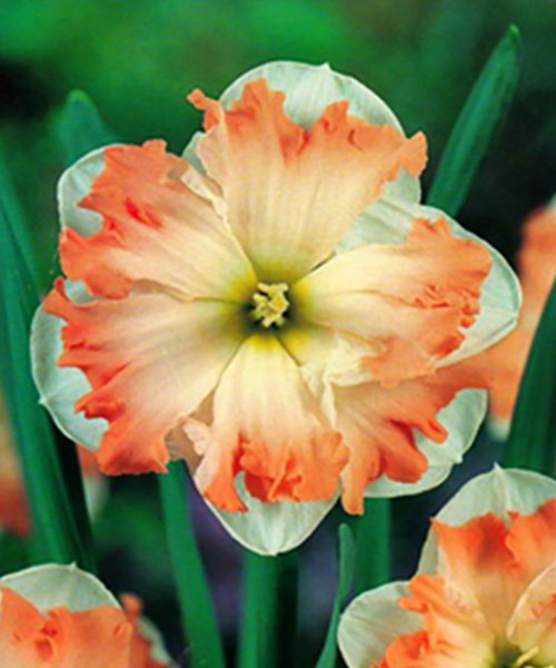 Нарцисс Cum Laude (Кум Лауда) - красивый, сильный и элегантный. Название сорта с латинского "с отличием". И действительно, этот прекрасный нарцисс сам по себе является высшей наградой садоводам. Распускается образуя широкие кремовые цветы, по краю оранжевой разрезанной короны проходит широкая, гофрированная розовая кайма. Период цветения длительный 2-3 недели. Глубина посадки должна в 2 раза превышать высоту луковицы нарцисса. Расстояние между луковицами при посадке - от 5 до 15 см в зависимости от размера луковицы. Для цветения нарциссов в январе, луковицы высаживают в августе.