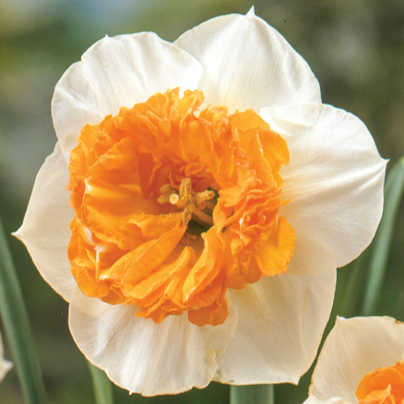 Высота цветоносов достигает примерно 40-50 см, их обрамляют темно-зеленые, узкие листья. Окрас лепестков уникальный, сочетает белые лепестки с оранжевой короной. Цветы обладают нежным и слегка сладким ароматом. Диаметр цветка около 10-12 см. Период цветения нарцисса конец апреля-май, длится 3 недели.