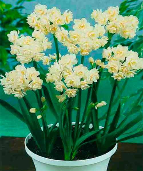 Нарцисс Erlicheer (Ерличир) - мультицветковый сорт. Имеет небольшие махровые цветы молочного цвета. На каждом стебле выростает около 10-15 шт. Высота цветоноса 35 см. Цветет с апреля по май. Глубина посадки должна в 2 раза превышать высоту луковицы нарцисса. Расстояние между луковицами при посадке - от 5 до 15 см в зависимости от размера луковицы. Для цветения нарциссов в январе, луковицы высаживают в августе.