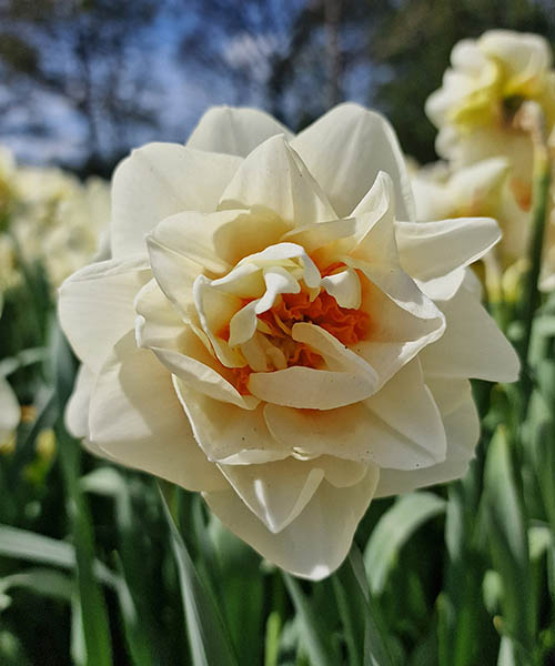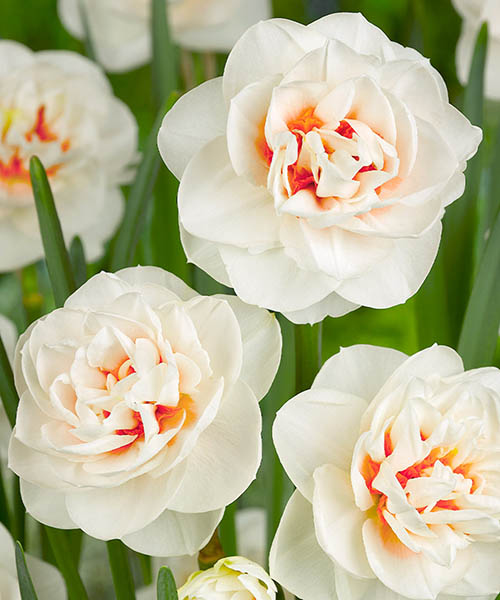 Нарцисс Гай Табор (Gay Tabor) – это роскошный махровый сорт, который удивит вас своим пышным цветением в конце весны. Этот сорт привлекает внимание крупными кремово-белыми цветками с оранжево-розовыми сегментами в центре, которые придают цветку уникальный вид, похожий на розу или пион. Благодаря своей эстетической привлекательности, Гай Лагерь является хитом продаж и подходит для опытных ценителей прекрасного. Высота стебля 45-55 см. Кремово-белые цветки диаметром 10-14 см с короткими розовато-оранжевыми сегментами в срединке с приятным ароматом. Начинает цвести в май и цветет в течение 2-3 недель. Подходит для сада, миксбордюра, бордюра, контейнера, выгонки и идеален для букетов.