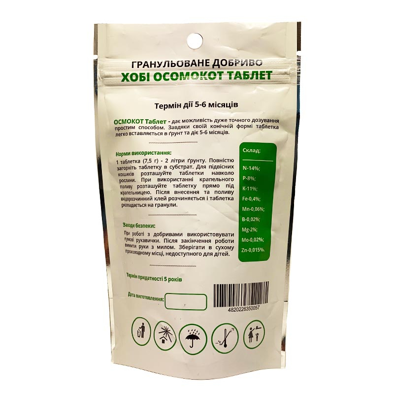 Хоби Осмокот Таблет 14-8-11+2MgO+Te – гранулированное минеральное удобрение длительного действия. Удобрение дает возможность точной дозировки простым способом. Благодаря своей конической форме таблетка легко вставляется в почву и действует 5-6 месяцев. Предназначена для лиственных, цветущих декоративных и комнатных растений. Осмокот значительно улучшает корневую систему и иммунитет растений, питая растения в течении всего периода роста.