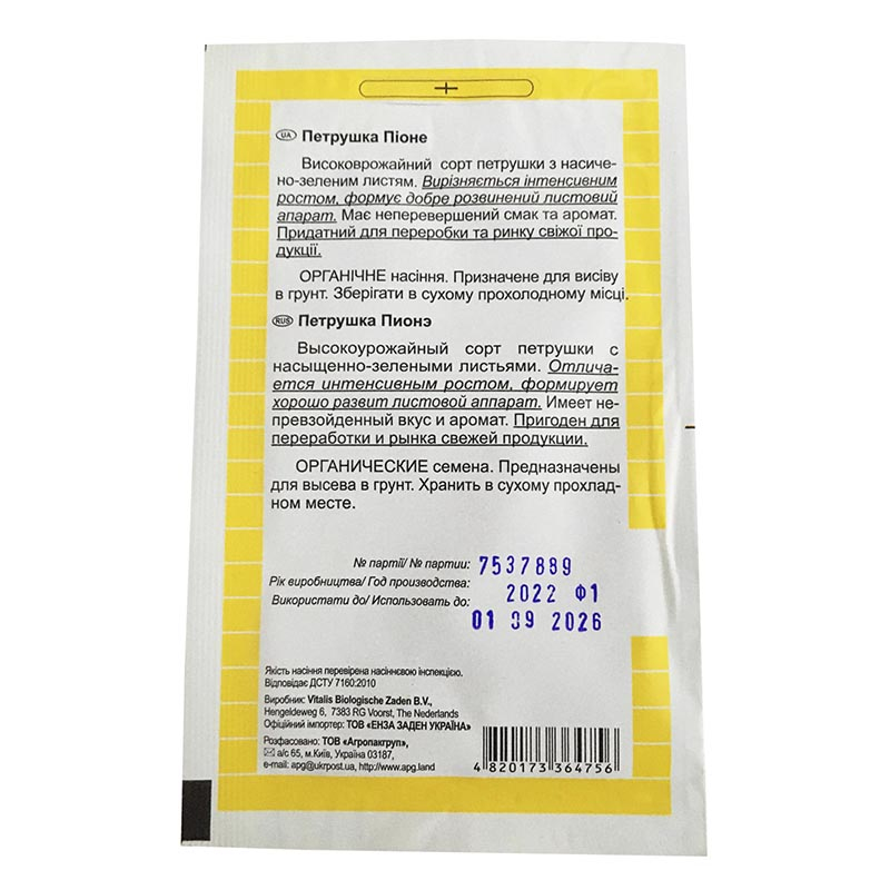 Петрушка Пионе – новинка, которая понравится всем огородникам. Растение имеет обильную зеленую массу, весьма продуктивно и может похвастаться коротким вегетационным периодом. Для полного созревания ей необходимо чуть больше 21 дня. Петрушка Pione обладает неповторимым вкусом и ароматом, которые еще долго сохраняются после среза. Культура светолюбива и теплолюбива, но не переносит засуху и жару. Поэтому следует выделять такой участок огорода под посевы, где после обеда наблюдается легкая тень. Семена петрушки Пионе прорастают 7 - 12 дней в зависимости от климатических условий культивации. Сходство посевного материала на уровне 95% как в условиях незащищенной почвы, так и при разведении культуры методом выведения рассады или в теплицах. Листовый и корневой аппараты растения развиты на достаточном уровне, что гарантирует стрессоустойчивость сорта и его выносливость в отношении болезней и вредителей. ! Семена органические, выращенные без генетически модифицированных организмов, синтетически химизированных удобрений и пестицидов, только с применением биологических удобрений.