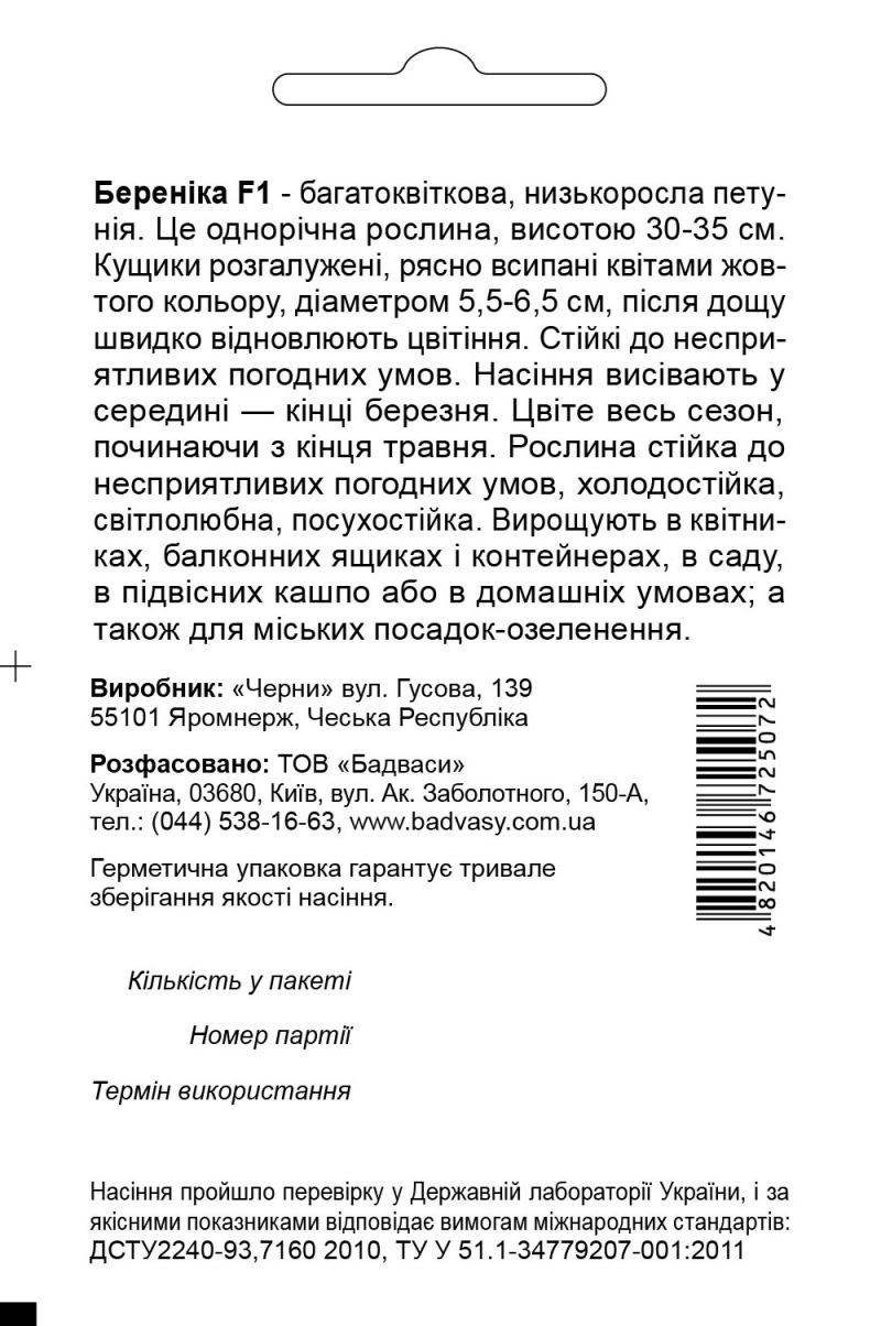 Петуния Береника F1 - многоцветковая, низкорослая петуния. Это однолетнее растение, высотой 30-35 см. Кустики разветвленные, обильно усыпаны цветами желтого цвета, диаметром 5,5-6,5 см, после дождя быстро восстанавливает цветение. Устойчиво к неблагоприятным погодным условиям. Семена высевают в середине - конце марта. Цветет весь сезон, начиная с конца мая. Растение устойчиво к неблагоприятным погодным условиям, холодостойкое, светолюбивое, засухоустойчивое. Выращивают в цветниках (клумбы, рабатки), балконных ящиках и контейнерах, в саду, в подвесных кашпо или в домашних условиях; а также для городских посадок-озеленения.