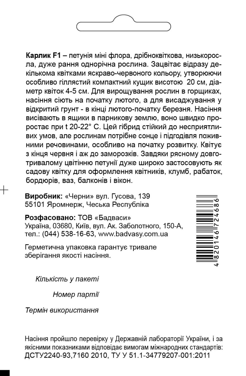 Петуния Карлик F1 - петуния мини флора, мелкоцветная, низкорослая, очень раннее однолетнее растение. Зацветает сразу несколькими цветками ярко-красного цвета, образуя особенно ветвистый компактный кустик высотой 20 см, диаметр цветков 4-5 см. Для выращивания растений в горшках, семена сеют в начале февраля, а для высадки в открытый грунт - в конце февраля-начале марта. Семена высевают в ящики в парниковой земли, оно быстро прорастают при t 20-22°С. Этот гибрид устойчив к неблагоприятным условиям, но растениям нужно солнце и подкормка питательными веществами, особенно в начале развития. Цветет с конца июня и до заморозков. Благодаря обильному длительному цветению петунии очень широко применяют как садовый цветок для оформления цветников, клумб, рабаток, бордюров, ваз, балконов и окон.