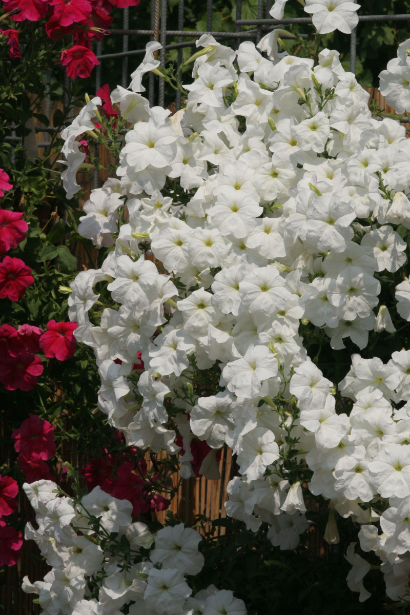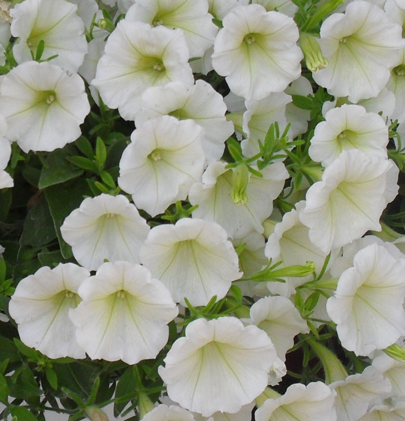 Петуния Лавина F1, белая - ампельная крупноцветковая, петуния. Это однолетнее растение, которое растет вертикально. В процессе роста побеги свисают, и образуют настоящую лавину из крупных белых цветов, диаметром 7-9 см. Для выращивания в горшках семена сеют в начале февраля, а для высадки в открытый грунт - в конце февраля-начале марта. Семена высевают в ящики с парниковой землей, быстро прорастают при t 20-22°С. Растения требуют много солнца и подкормки, особенно в начале развития. Цветение обильное и длительное (цветут с июня по октябрь). За щедрые подкормки они вознаградят вас морем цветов. Очень эффектны в балконных ящиках, подвесных корзинах, вазонах. Их часто высаживают на склонах альпийских горок.