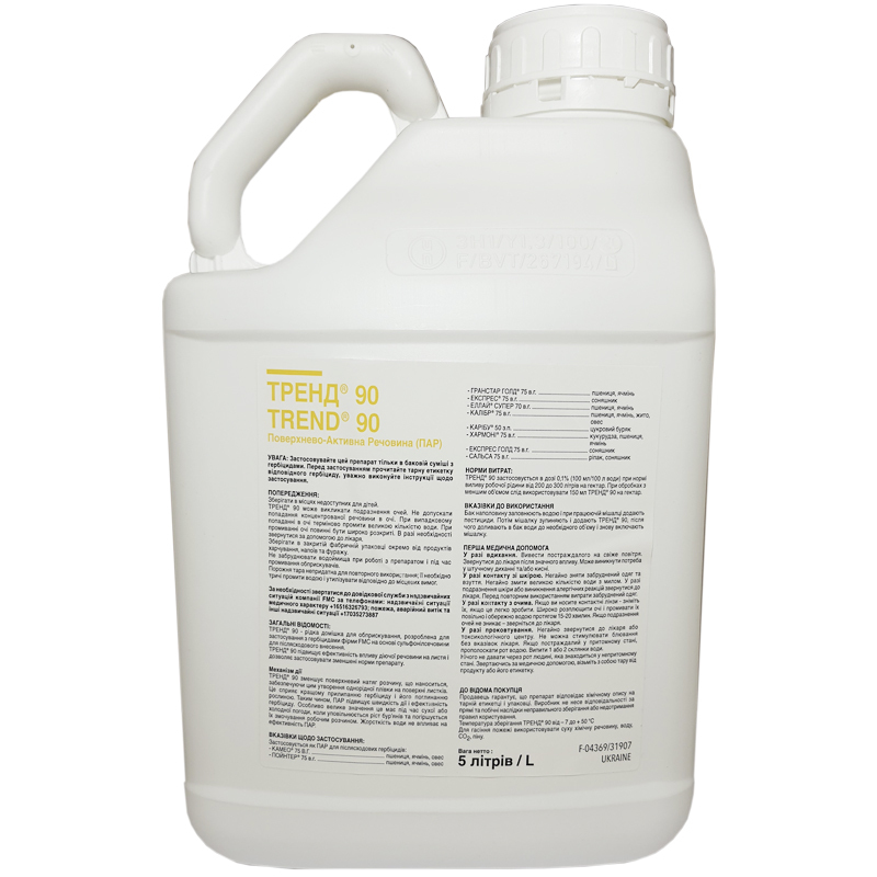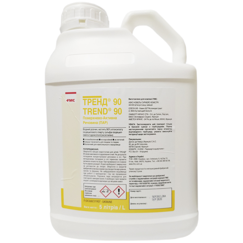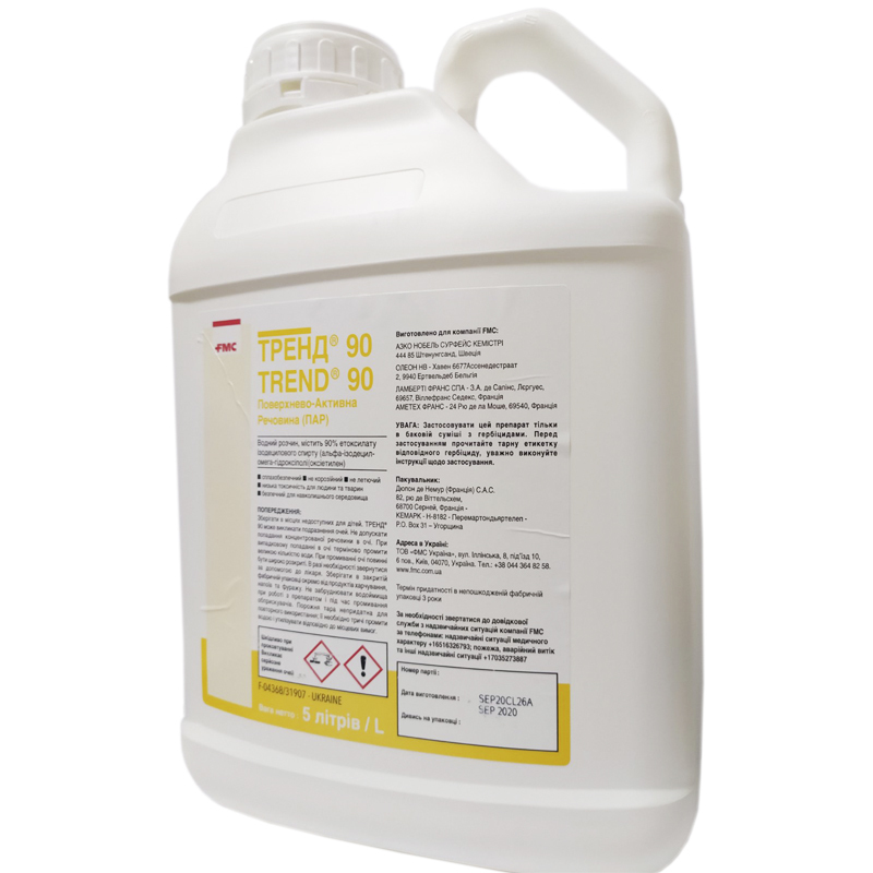 Тренд - Поверхностно-активное вещество разработано для применения с сульфонилмочевинными гербицидами компании "Дюпон". Состав: содержит 90% этоксилат изодецилового спирта (альфа-изодецил-омега-гидроксиполи (оксиэтилен) Свойства - огнеопасен; - не вызывает коррозию; - не летучий; - безопасен для окружающей среды.