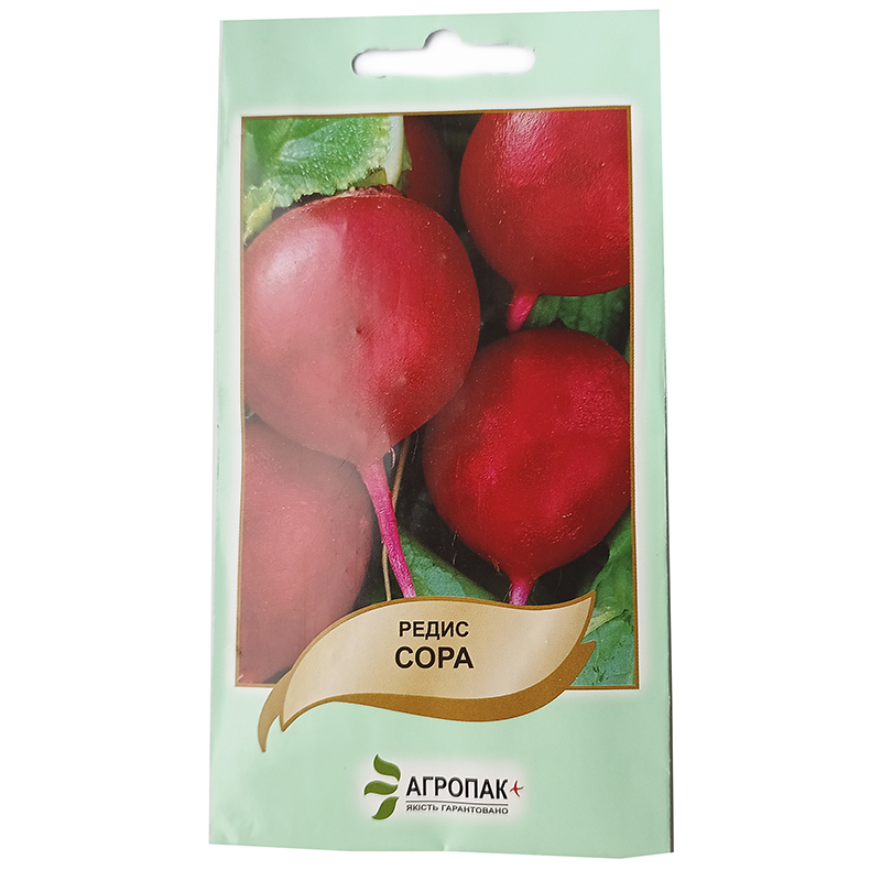 Редис Сора – это раннеспелый сорт. Период вегетации – 20-23 дней. Листовая розетка небольшая. Корнеплод округлый, диаметром 3-4 см, насыщенно красного цвета с гладкой тонкой нежной кожурой, массой 20-25 г. Мякоть прозрачно-белая, сочная, нежная. Обладает довольно деликатным вкусом. Урожайность – 170-180ц/га. Долго сохраняет товарные свойства. Сорт пригоден для выращивания в открытом и закрытом грунте. Устойчив к высоким температурам и стрелкованию. Подходит для весеннего, летнего и осеннего выращивания. Высокая стойкость к слизистому бактериозу и ложной мучнистой росе. Сора особенно устойчива к условиям длинного светового дня, когда другие сорта редиса ухудшают качество продукции или даже стрелку. Поэтому его можно выращивать даже летом.