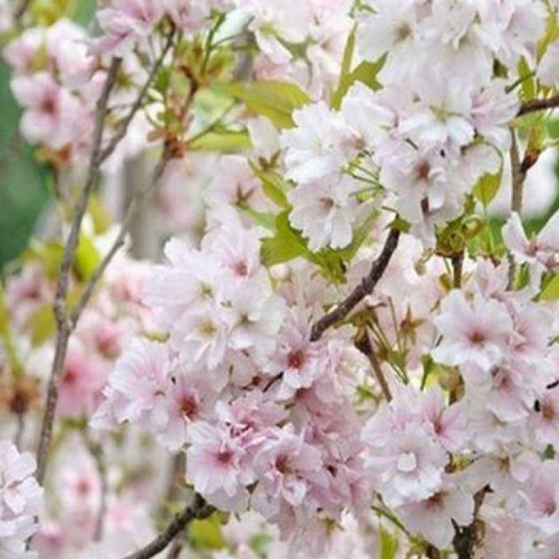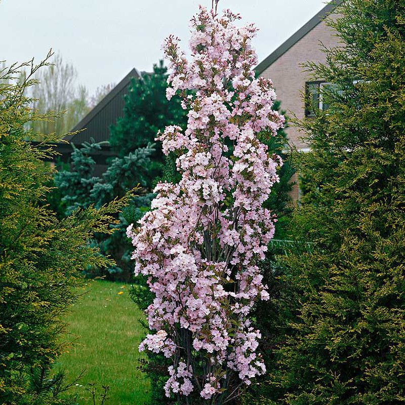 Сакура колоновидная Аманогава - это небольшое дерево с плотной, колоновидной кроной. В высоту достигает 5 метров, 1-2 метра в ширину. Цветение - в мае, цветки светло-розовые, махровые, около 4 см в диаметре.
