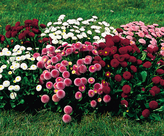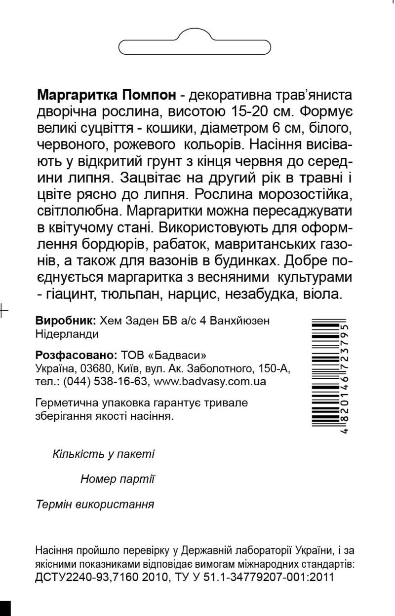 Маргаритка Помпон - декоративная травянистое двухлетнее растение, высотой 15-20 см. Формирует крупные соцветия - корзинки, диаметром 6 см, белого, красного, розового цветов. Семена высевают в открытый грунт с конца июня до середины июля. Зацветает на второй год в мае и цветет обильно до июля. Растение морозостойкое, светолюбивое. Маргаритки можно пересаживать в цветущем состоянии. Используют для оформления бордюров, рабаток, мавританских газонов, а также для вазонов в домах. Хорошо сочетается маргаритка с весенними культурами - гиацинт, тюльпан, нарцисс, незабудка, виола.