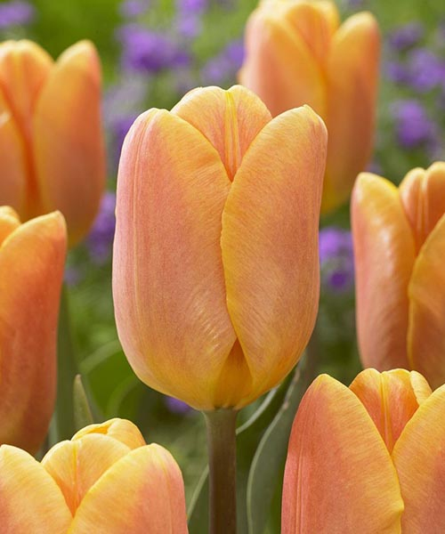 Тюльпан Belleville – имеет великолепные, крупные персиково-оранжевые цветы, бокаловидной формы, по краю имеют мандариновый оттенок. Растение выростает высотой 40-50 см. Цветок диаметром 9-12 см, цвет листьев зелёный. Тюльпан имеет очень прочные стебли, что делает их устойчивыми к весенней непогоде – ветру и дождю. Сорт цветёт в апреле-мае. Цветам данного сорта присущ ненавязчивый тонкий аромат. Belleville относят к классу тюльпанов Triumph.