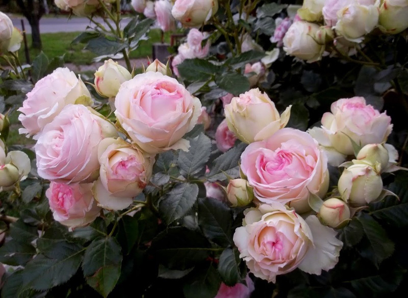 Наверное, именно так и должны выглядеть райские растения: крупные, сильные ярко зеленые кусты, кожистые листья, а верхушки побегов венчают кисти розовых бутонов невероятной красоты. Эти розы описаны тысячи раз, но ни одно описание не отражает истинной картины. Крупные, густомахровые с закрученной серединкой, чашевидные розы с высоким лепестками светло-кремового цвета и с розовой каймой по краям. Удивительными видятся и крупные кисти цветов — согласитесь, цветы в количестве 7-9 штук в одной кисти, явление нерядовое.