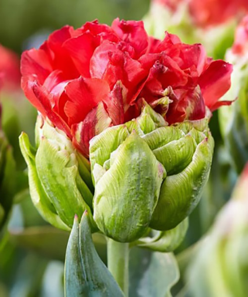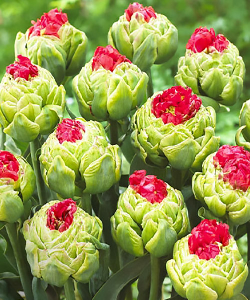 Тюльпан Bull's Eye - це пізньоквітучий сорт, голландської селекції прекрасно виглядає в одиночних і групових посадках, його активно вирощують на зріз для складання ефектних букетів. Висота квітконоса досягає 40-50 см. Бутон махровий, ефектний, в діаметрі 8-9 см. Забарвлення оригінальне, зелені пелюстки прикрашені червоними пелюстками, які утворюють ідеальну серцевину. Цвіте в травні. Аромат приємний і легкий.