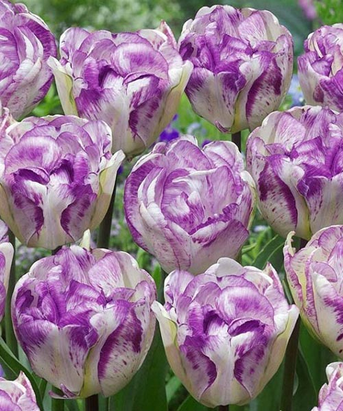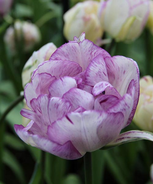 Тюльпан Shirley Double в цвітінні формою нагадує півонію, а забарвленням схожий на гілочку бузку. Рівна ніжка (до 45 см) внизу прикрашена класичним лінійним листям. Бутон густомахровий, зберігає форму до 10-14 днів. Висота квітки 6-7 см, діаметр 8-10 см. Пелюстки численні, красиво складені, білі, ближче до вершини бузкових вкраплень стає більше. Виглядає квітка ніжно і романтично, стане головною прикрасою травневої клумби. Якщо посадити поруч бузкові тюльпани і рожеві нарциси, то в саду стане казково красиво.