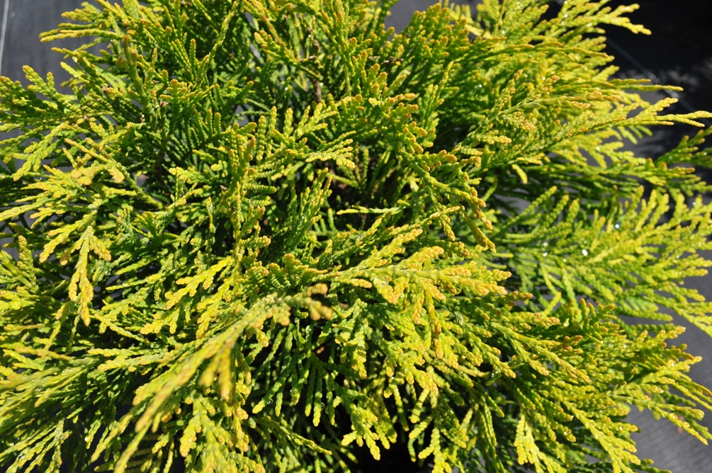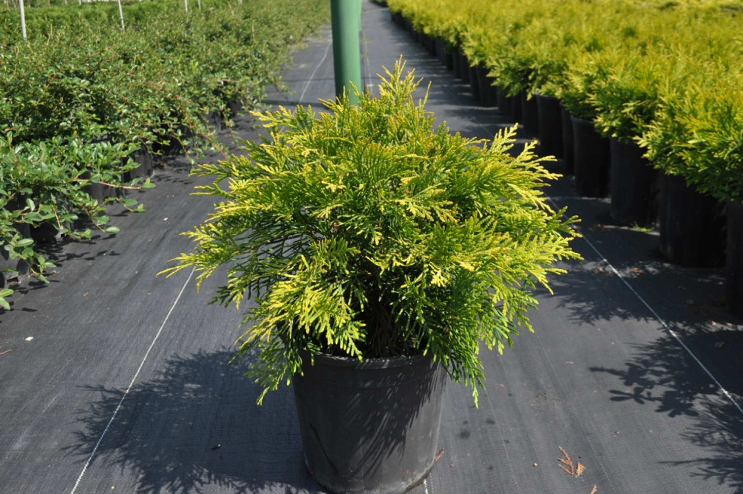 Туя західна "Голден Глоб" РОЗМІР: висота до 1,5 м. ширина до 0,8 м. ФОРМА: куляста крона. Пагони прямі і плоскі, підняті вгору, густі, що перекриваються, рівномірно розростаються в сторони. ХВОЯ: хвоя золотисто-жовтого кольору. Жовті кінчики пагонів, яким дістається багато сонця, повністю покривають рослину, хоча всередині кулі хвоя яскраво-зелена. Восени набуває мідний відтінок, а навесні знову стає золотистою. МІСЦЕ РОЗТАШУВАННЯ: своє золоте забарвлення набуває тільки на сонячних ділянках або в напівтіні. ОСОБЛИВОСТІ: невибаглива, добре росте на всіх родючих, свіжих і вологих ґрунтах, від кислих до лужних. ВИКОРИСТОВУЄТЬСЯ: ідеально підходить для невеликих садів. Її можна висаджувати як солітер на газоні, використовувати для невисокого вільноростучого живоплоту, поєднувати з іншими гарноквітуючими рослинами і рослинами з контрастним листям в міксбордерах. Рядові невисокі строкаті посадки уздовж фасадів адміністративних і офісних будівель, торгових центрів. Хвойний вічнозелений живопліт жовтого кольору.