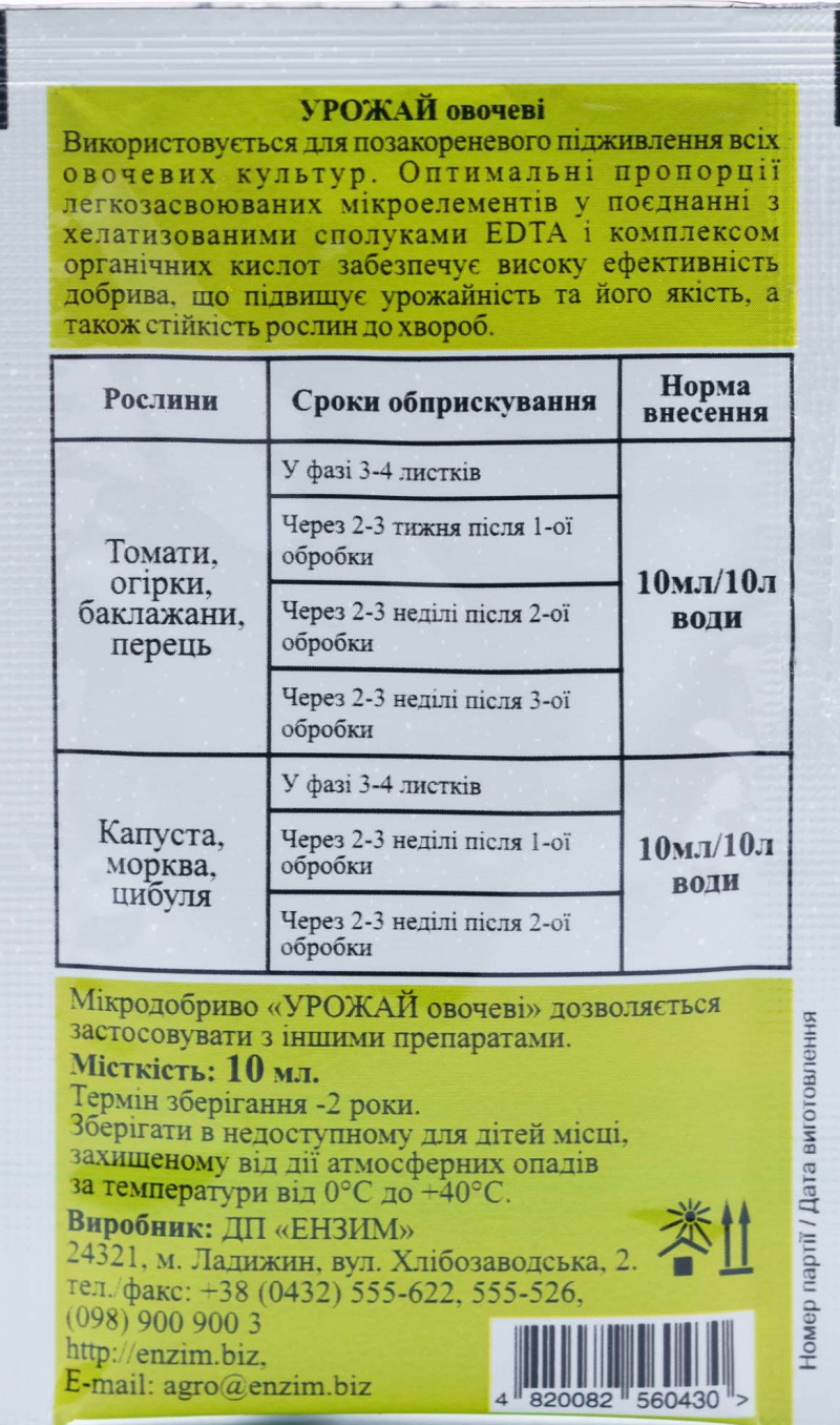 Добриво Урожай овочеве 10 мл, Ензим-агро