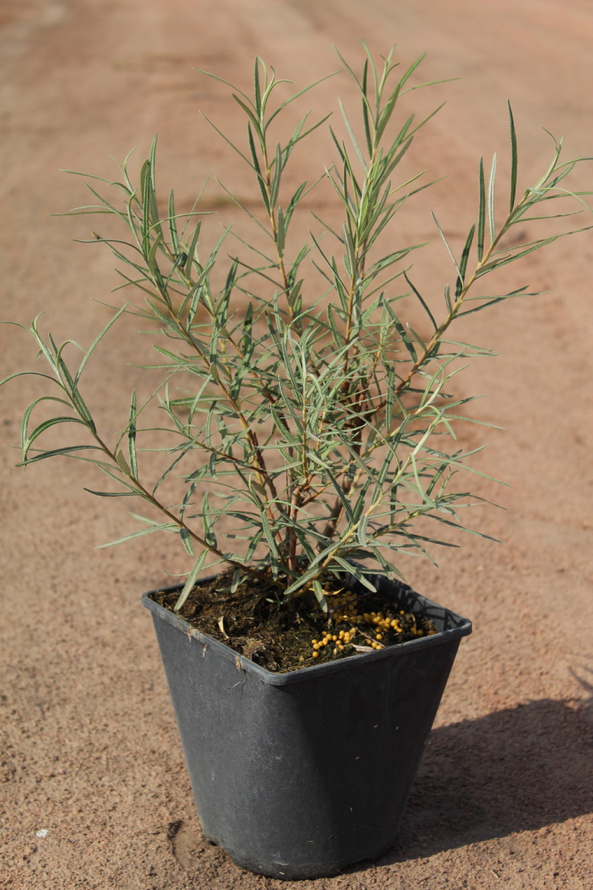 Верба Ангустіфолія (розмаринолистяна) це листопадний широкий чагарник з вертикальними, вузькими, червоно-коричневими пагонами, через кілька років зовнішні гілки дугоподібно звисають, повільноростуща. Листя розташоване по черзі, довгасте 5-10 см завдовжки, темно зеленого кольору. Восени набувають жовтого забарвлення. Цвіте в квітні, утворюючи довгасті жовті сережки. Цей сорт верби невимогливий до місця посадки, але віддає перевагу більш вологому, вапнованому грунту.