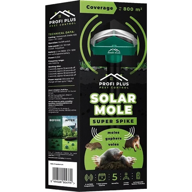 Super Spike випускає ефективний розподіл звукових імпульсів через глибокі шляхи та порожнини, що дозволяє максимально впливати на чутливу акустичну систему кротів. Цей відлякувач використовує передову сонячну батарею, яка накопичує енергію сонця протягом дня і гарантує необмежений час роботи навіть вночі. Повного заряду акумулятора вистачає до 7 днів безперервної роботи навіть при похмурій погоді.