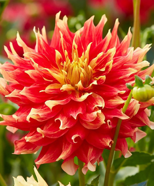 Жоржина Bodacious це бульбовий сорт з високою декоративністю, тривалим терміном цвітіння та невибагливістю у догляді. Ці квіти вирощують у саду та горщиках, створюючи стильні композиції. Даний сорт має насичені відтінки червоного та жовті штрихи, відноситься до великоквіткових різновидів і виглядає просто шикарно в кожній створеній посадці.