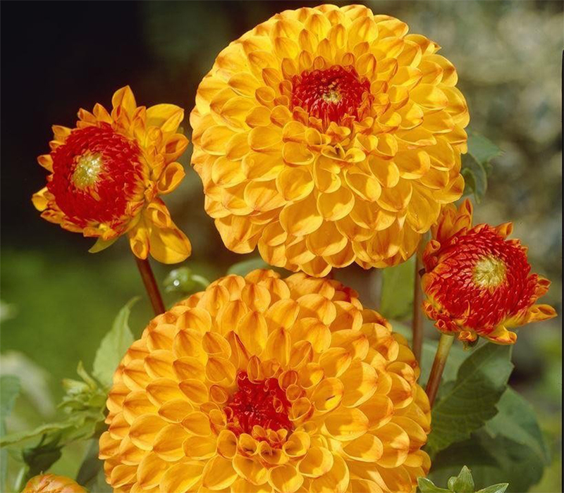 Жоржина Glow - справжня прикраса саду, красиві квіти з безліччю маленьких кулястих суцвіть, що нагадують формою помпончик - звідси і назва виду. Квіти насичено-жовтого кольору із веселими червоними серединками. А вже через два місяці після висадки жоржини в грунт, починається їх безперервне цвітіння. Під час якого кущ буквально усипаний симпатичними квітками діаметром 5-7 см. Жоржина помпонная особливо стійка до змін погоди. Особливо гарна ця жоржина для зрізу. У квітні бульби жоржин слід підготувати до посадки. Бульби висаджують в ємність з поживною землею або торфом так, щоб вони виступали на 2-3 см над поверхнею, і тримають їх два тижні при температурі не нижче 18 °C при хорошому освітленні. Висаджувати жоржини в грунт можна тільки після того, коли прогріється земля, зазвичай це роблять в кінці травня або початку липня. Ямки під жоржини повинні бути більше грудки коренів в три рази, щоб коріння жоржини занурилося в них повністю і залишилося ще 5-7 см вільного простору. Якщо ви вибрали сорт високорослих жоржин, встановіть і закріпіть відразу опору для майбутнього стебла. Після посадки рясно полийте холодною водою, а грунт навколо них замульчуйте. Поливати жоржини потрібно 1-2 рази в тиждень, але не дозволяйте волозі застоюватися в коренях. Після перших заморозків бульби жоржин потрібно викопати, обрізати, залишивши лише п'ять-десять сантиметрів стебла. Найкраще зберігати бульби при температурі 3-5 °C при вологості повітря 60-70% в добре провітрюваному приміщенні.