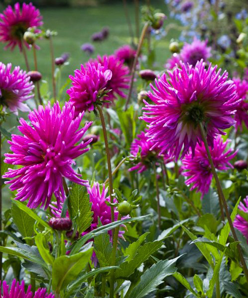 Жоржина Purple Gem (Перпл Джем) - чудова крупноквіткова махрова, з формою квітки типу Кактусова. Вузькі рожево-лілові пелюстки формують пишні квітки. У міру відцвітання, забарвлення змінюється і стає більш темно-ліловое пурпурове. Бутони - світло рожеві, з'являються з кінця липня, а в серпні-вересні - весь кущ усипаний величезними квітками, цвітіння триває до перших заморозків. Квітки в повному розпуск - величезні до 25 см в діаметрі, дуже об'ємні. Сучасні сорти дуже пластичні, рясно цвітуть і на сонці, і в півтіні. Прекрасно підходять для посадок групами. Висота кущів від 90 см до 110 см, ширина куща - до 60 см.