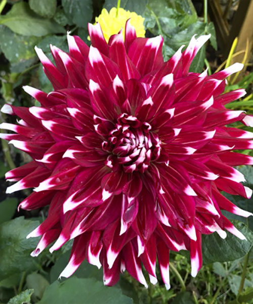 Жоржина X-Factor - бордова розкіш для саду. Міцні квітконоси прикрашає темно-зелене листя, а вершину вінчає величезний бутон декоративної форми. Пелюстки видовжені, насиченого бордового забарвлення з білим кінчиком.