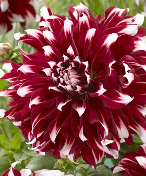 Жоржина X-Factor - бордова розкіш для саду. Міцні квітконоси прикрашає темно-зелене листя, а вершину вінчає величезний бутон декоративної форми. Пелюстки видовжені, насиченого бордового забарвлення з білим кінчиком. Вони чудові у букеті, тримають зріз 7-12 днів. Багаторічник любить світло та поливи, а натомість обдаровує цвітінням до заморозків. Вдало поєднується з хризантемами, гладіолусами, дельфініумами. Кущ потужний, висотою 90-150 см, шириною 30-60 см. Квітка діаметром 18-25 см, забарвлення бордове з білим, форма декоративна. Листя смарагдово-зелене. Формуються бутони у липні-вересні.