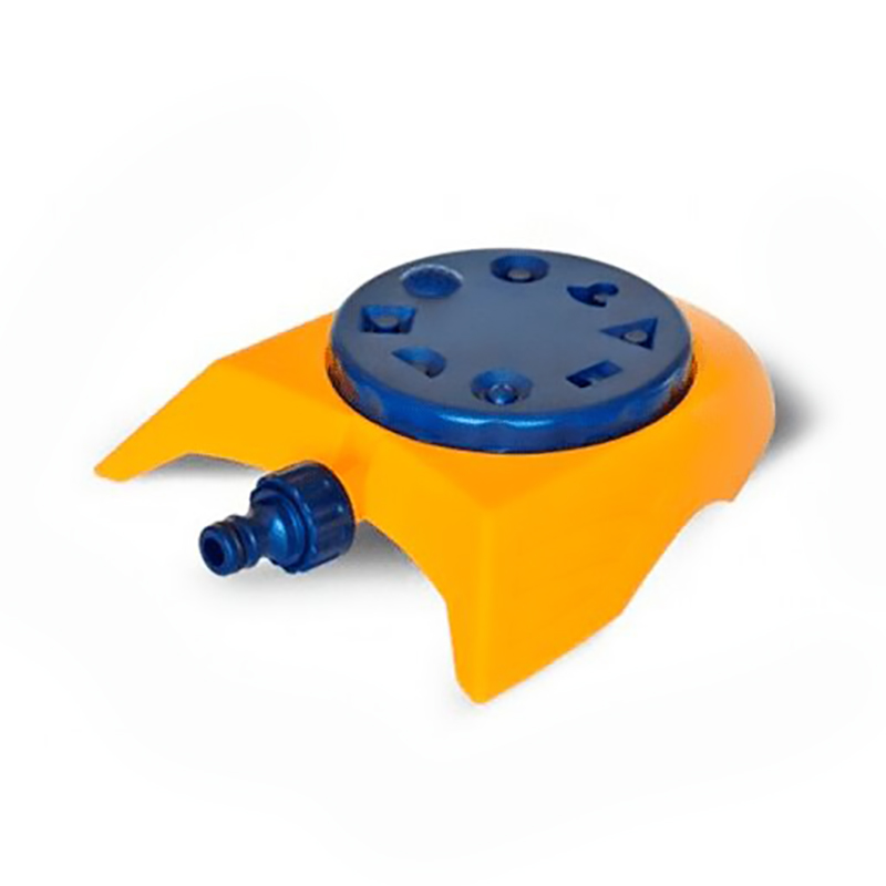 Зрошувач розміщений на міцній, стійкій, пластиковій платформі, яка забезпечує максимальну стійкість і не пошкоджує дерен. Виготовлений з високоякісного пластику. Оснащений стандартним з'єднанням для підключення шланга за допомогою коннектора, закрита зовнішня різьба дозволяє з допомогою адаптера включити в послідовну систему поливу. -